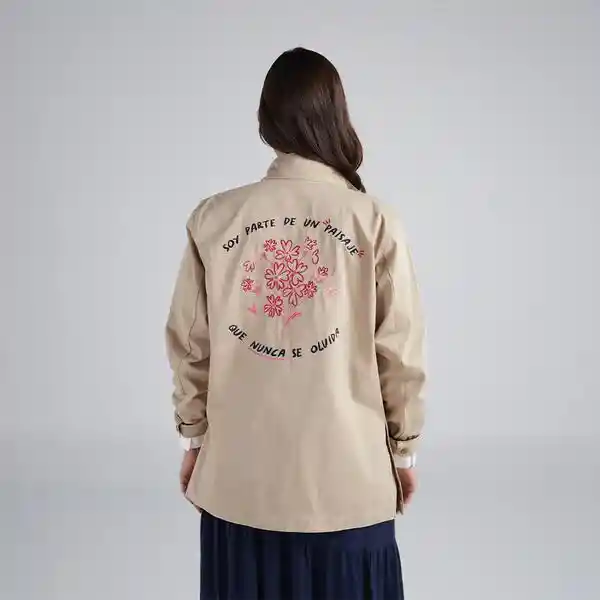 Chaqueta caqui con bolsillos delanteros de parche rectangular en la parte inferior, cuello redondo y manga larga. Cuenta con arte en el delantero izquierdo y en la parte posterior. Composición: 100% algodón. La modelo mide 1,73 m y usa talla XS. Cuidados especiales: Leer la etiqueta de cuidados antes de lavar.