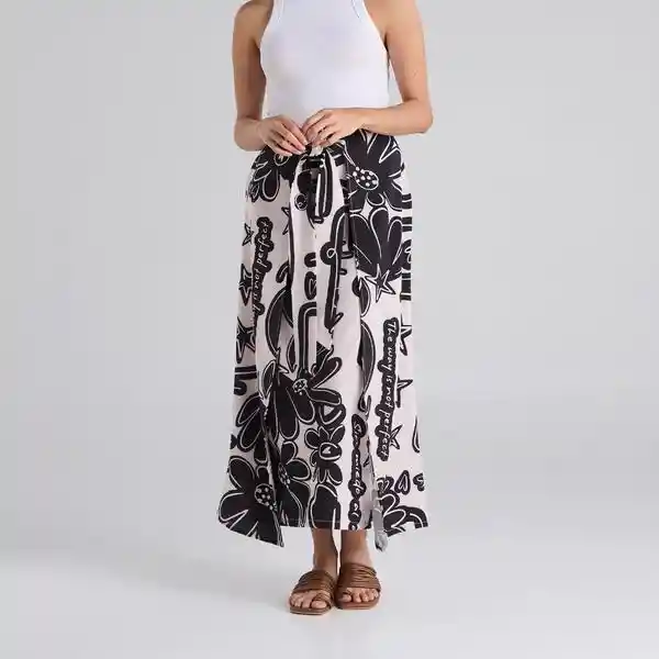 Falda larga estampada en tono arena, de corte tipo “A” con diseño cruzado tipo pareo. Presenta detalle de lazo en la cintura para anudar y cierre posterior oculto. Composición: 88.7% Poliéster, 11.2% Elastómero. La modelo mide 1.60 m y usa talla S. Cuidados especiales: Leer la etiqueta de cuidados antes de lavar.