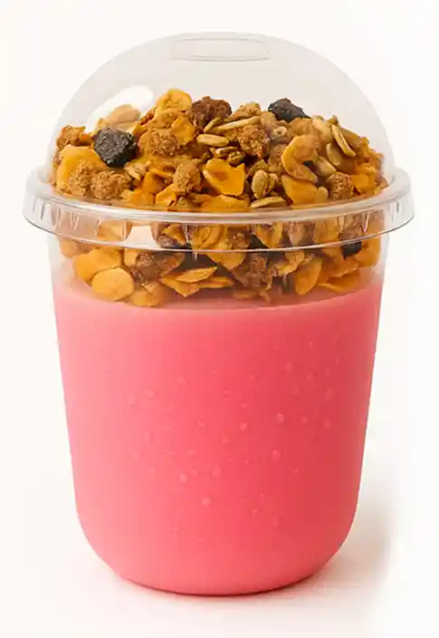 Delicioso Yogurt dulce de fresa acompañado de cereal de maíz y granola...perfecto para un desayuno o snack
