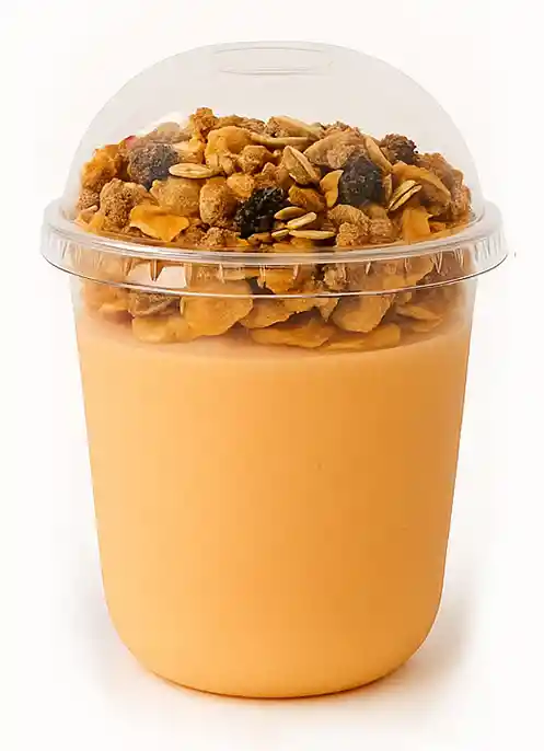 Delicioso yogurt dulce de melocotón acompañado de cereal de maíz y granola, tamaño ideal para un snack o desayuno saludable!