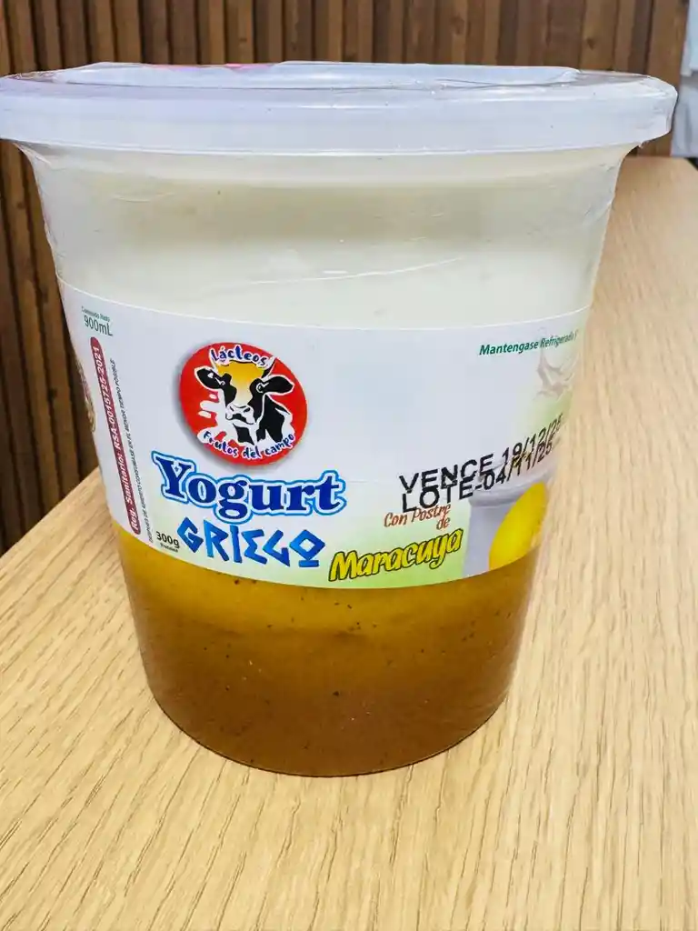 Yogurt Griego con pulpa de fruta real 100% sabor a Maracuya sin saborizantes ni conservantes artificiales de 900 ml Artesanal, con probióticos contiene 9g de proteína por porción.