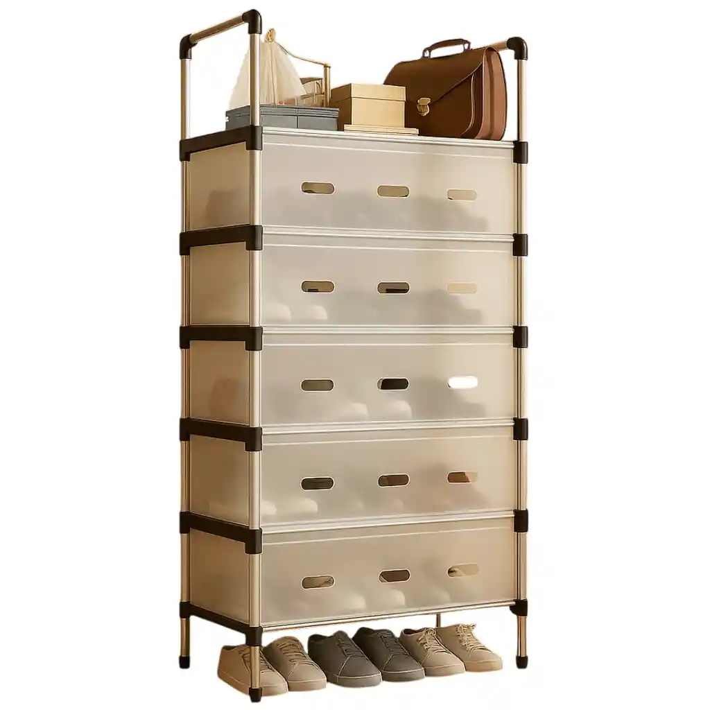 Zapatero Moderno de 5 Niveles con Cajones y Espacio Extra – Organización Inteligente para tu Calzado Pensado para quienes buscan un mueble funcional, práctico y con un diseño cuidado, este zapatero es ideal para mantener tu calzado siempre ordenado. Cuenta con 5 compartimientos con cajón y 1 compartimiento libre en la parte superior para optimizar el almacenamiento. Características clave: Material resistente y duradero: Tubos metálicos robustos y tela de calidad para garantizar estabilidad. Diseño elegante: Acabado en tonos neutros que combina con cualquier estilo de decoración. Protección y orden: Los cajones mantienen los zapatos aislados del polvo y bien organizados. Espacio libre adicional: El compartimiento superior es perfecto para artículos de uso frecuente. Gran capacidad: Almacena hasta 20 pares de zapatos cómodamente. Fácil armado y traslado: Diseño modular para montar y desmontar sin complicaciones. Nota de garantía: Incluye garantía de 30 días por defectos de fábrica, asegurando tu compra y tu tranquilidad.