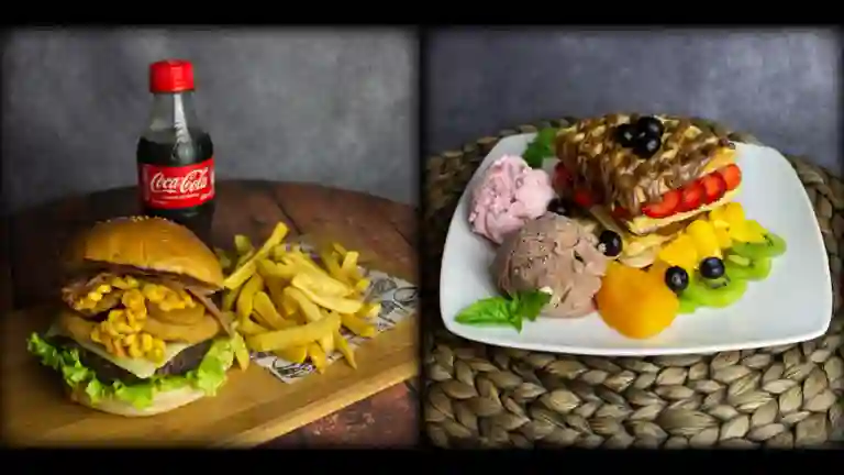 2 Hamburguesas de 130gr de carne de res artesanal, tomate, lechuga, queso mozzarella y cebolla asada en salsa bbq ahumada. 2 gaseosa 250ml y 2 papas.