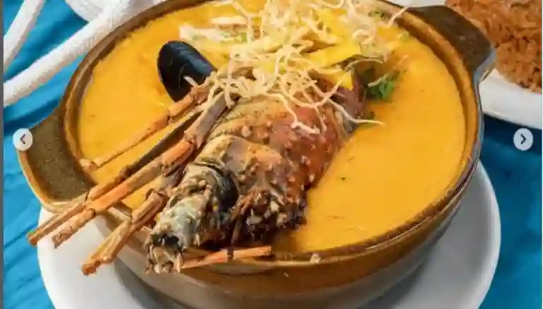 Mariscos en variedad cocidos en una suculenta bisque de camarón, acompañado con arroz de coco y patacones. Seafood stew cazuela cooked in a delicious shrimp bisque with coconut rice and fried plantains.