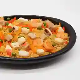 Arroz salteado acompañado de mixtura de mariscos, camarones, platano.