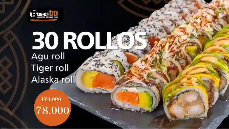 30 Piezas de sushi, 10 piezas de alaska roll con salmón, queso crema, topping de aguacate, salmón, wakame y masago, 10 piezas tiger especial y 10 piezas agu roll langostinos crocantes, cebollina, queso crema con toping de aguacate, bañado en salsa fuji y teriyaki.