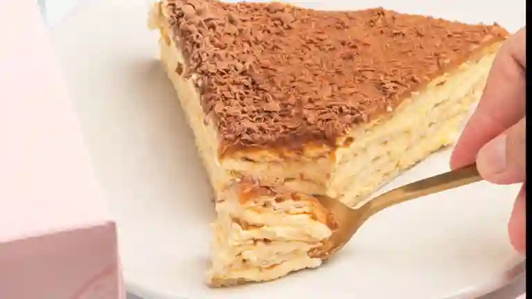 Una porción de postre pavé : capas de crema tradicional, galleta dulce cubierto de arequipe y chocolate rayado. caja rosada mide 8x8cm.