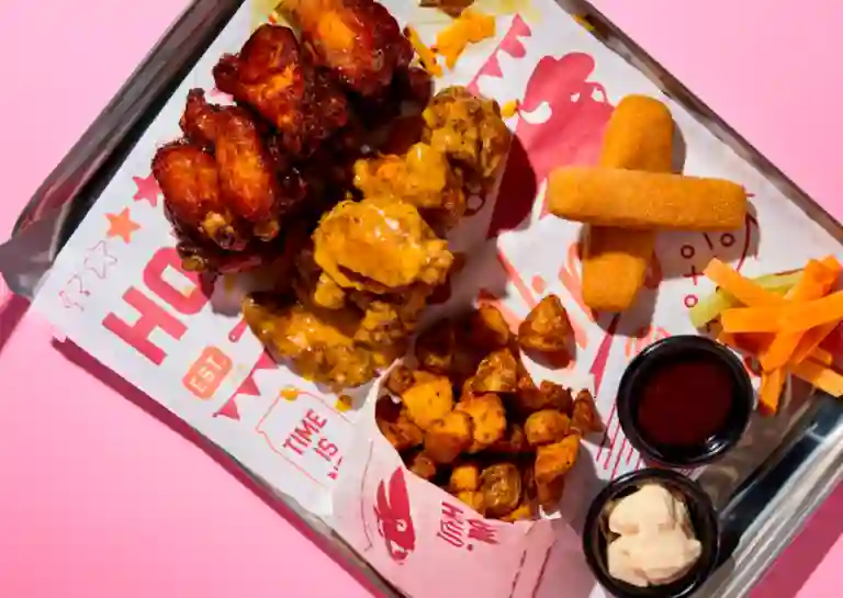 18 alitas, 400grms de costilla bbq, 8 dedos de mozzarella, 250 grms de crispetas de pollo, 2 porciones de papa dorada, 2 porciones de apio y zanahoria y queso azul .