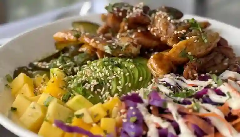 Proteína y base a elegir, mango, ensalada, pepinillos, aguacate y salsa teriyaki.