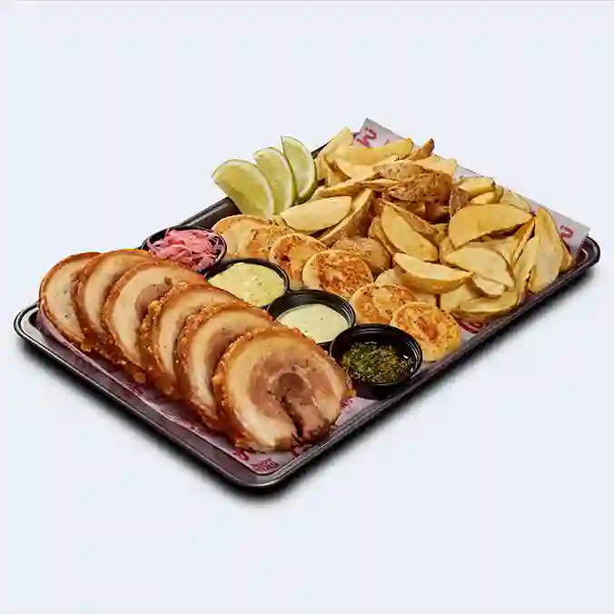 Tocino elaborado al horno 500 gr con papas rústicas, 6 arepas de queso y chimichurri de piña tipo ceviche de la casa.