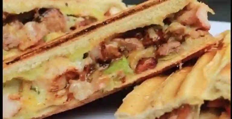 Sandwich con pan, jamón, mozzarella, carne, pollo y papas fritas.