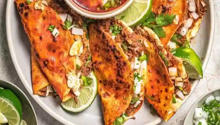 Quesadilla con costra de queso, carne de birria, cebolla, cilantro y salsa. Incluye consomé para acompañar.