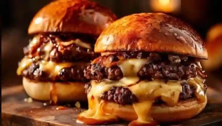 Pan brioche, vegetales fresco, carne de res, cerdo en salsa bbq de bocadillo, salsa de queso chédar, aros de cebolla apanados en panko, queso blanco, queso chédar y tocineta.