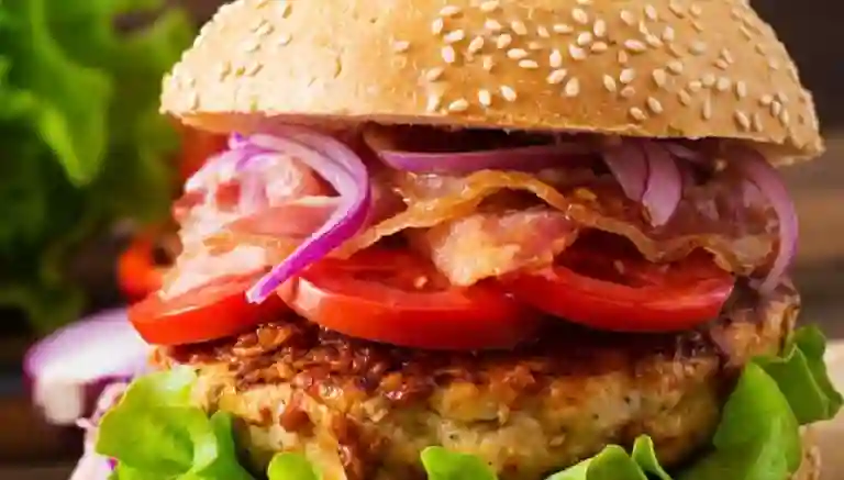 Hamburguesa con 135 g de pechuga a la plancha, tocineta crocante, queso, lechuga, tomate y salsas crema de leña y bbq.