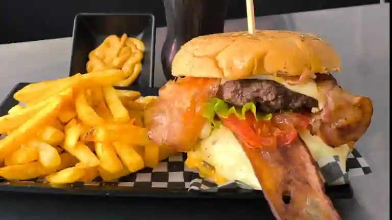 Pan artesanal de orégano, doble carne de res 260gr, doble tocineta, doble queso mozzarella, tomate rojo, lechuga crespa y salsa de la casa.