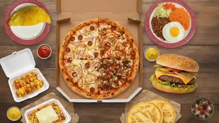 Pan pizza, carne artesanal de 130g, pollo, chorizo, queso, tomate, papas ripio, lechuga, cebolla, jamón, huevo, tocineta, aguacate, maíz y salsa al gusto.