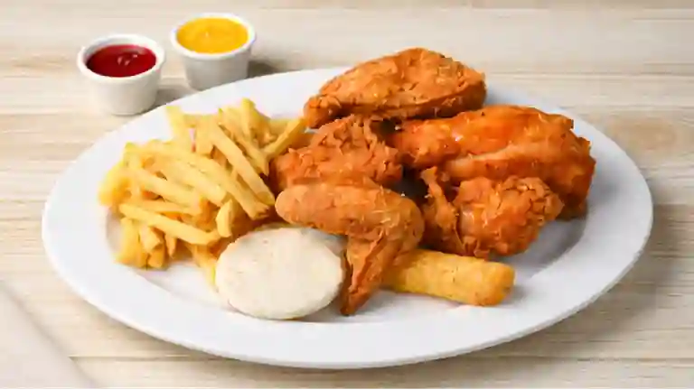Medio pollo broaster, acompañado de papas a la francesa, yuca y arepa.