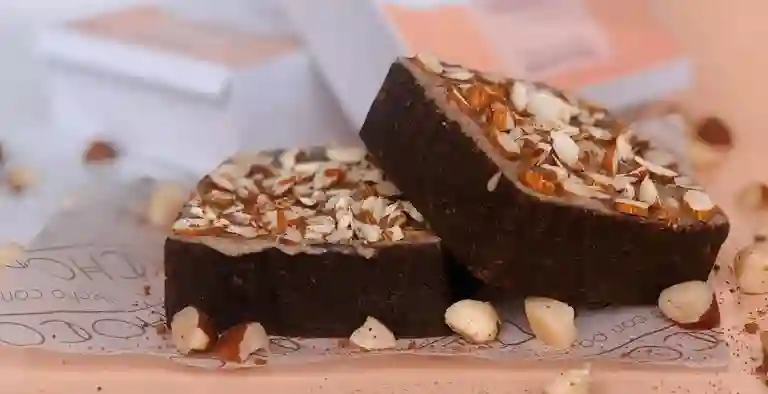 Harina de avena, cacao 75, aceite de coco, huevo, leche deslactosada y descremada, frutos secos y panela, coronado con una capa de crema y almendras fileteadas. Sin conservantes, sin aditivos. Mantengase refrigerado para su conservación.